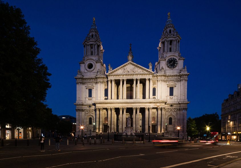 The main entrance of St Paul’s Cathedral once again beautifully lit