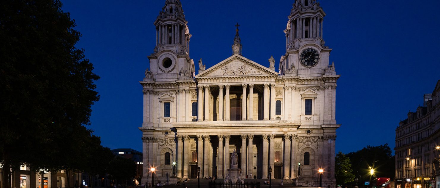 The main entrance of St Paul’s Cathedral once again beautifully lit